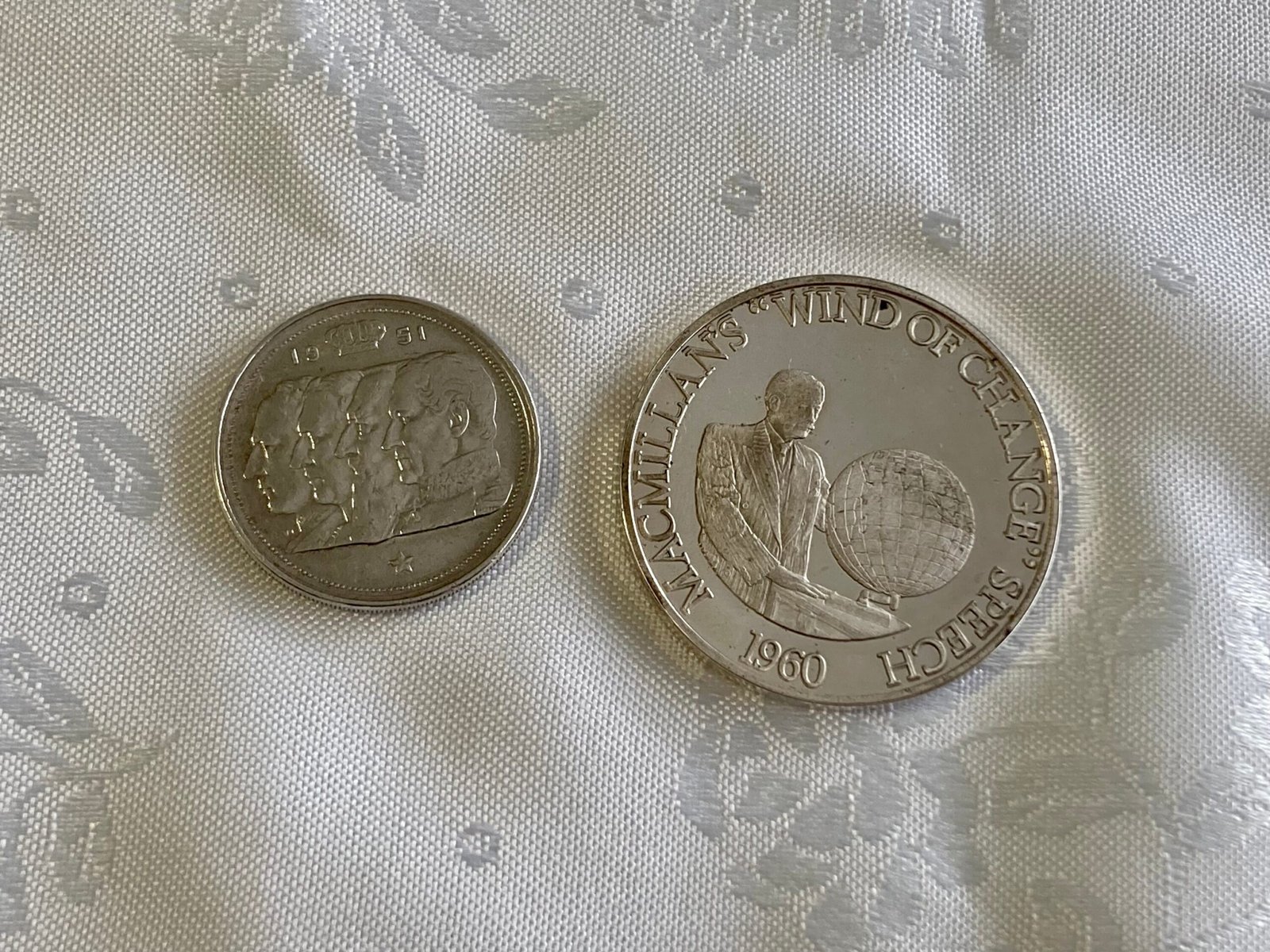 -MONEDA DE PLATA DE MACMILLANS “WIND OF CHANGE” 1960 SPEECH (1977) 45.4g -MONEDA DE PLATA DE BELGICA 100 FRANCOS (1951) 18g