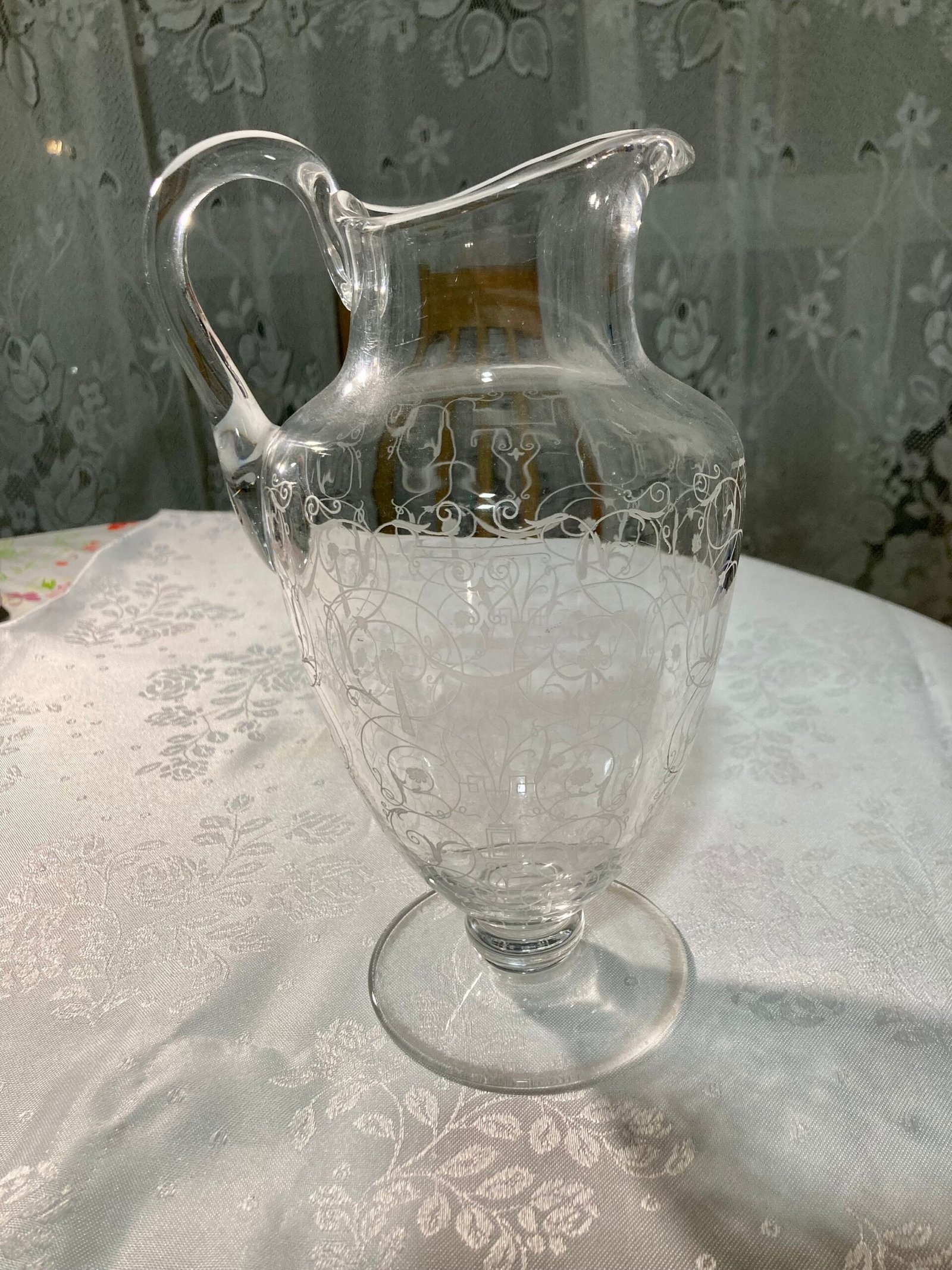 Jarra o cántaro de cristal de Baccarat, estampado, hacia 1910. El diseño grabado de arabescos que recuerdan las decoraciones del gran maestro italiano. El éxito que tuvo le permitió estar disponible en muchas formas, incluidos jarrones.